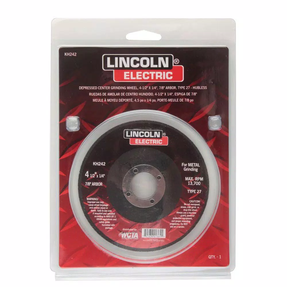 The Lincoln Electric 4-1/2 in. x 1/4 in. Type 27 Grinding Wheel is compatible with air or electric-powered right angle or vertical-shaft grinders. It is a great choice for projects involving metal fabrication or auto body work. Depressed center wheels are also designed for use in welding and repair.