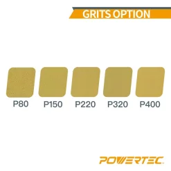 【POWERTEC 6-Inch PSA Gold Aluminum Oxide Sanding Discs (10-Pack)】 These easy to use sander accessories are designed to provide you with the ultimate finish to your wood working projects and applications. Flaunting extra fine 220 grit, each disc provides exceptional cutting power for high precision polishing and sanding. They are constructed out of aluminum oxide, delivering industrial strength grain that is durable with tough cutting edges, and designed to seamlessly integrate with any standard sanding application. 【Pressure Sensitive Adhesive】 In addition to an anti-clogging coating that reduces pitch buildup, these tear resistant sanding accessories are resin bonded and backed with the highest quality 【pressure sensitive adhesive (PSA)】 providing you with an easy, dependable and secure installation of your sanding components. SPECIFICATIONS: Disc Size: 6-Inch. Grit Size: 60/ 150/ 220/ 320/ 400 Grit. Material: Aluminum Oxide (A/O) Grain. Package: 100 pieces.