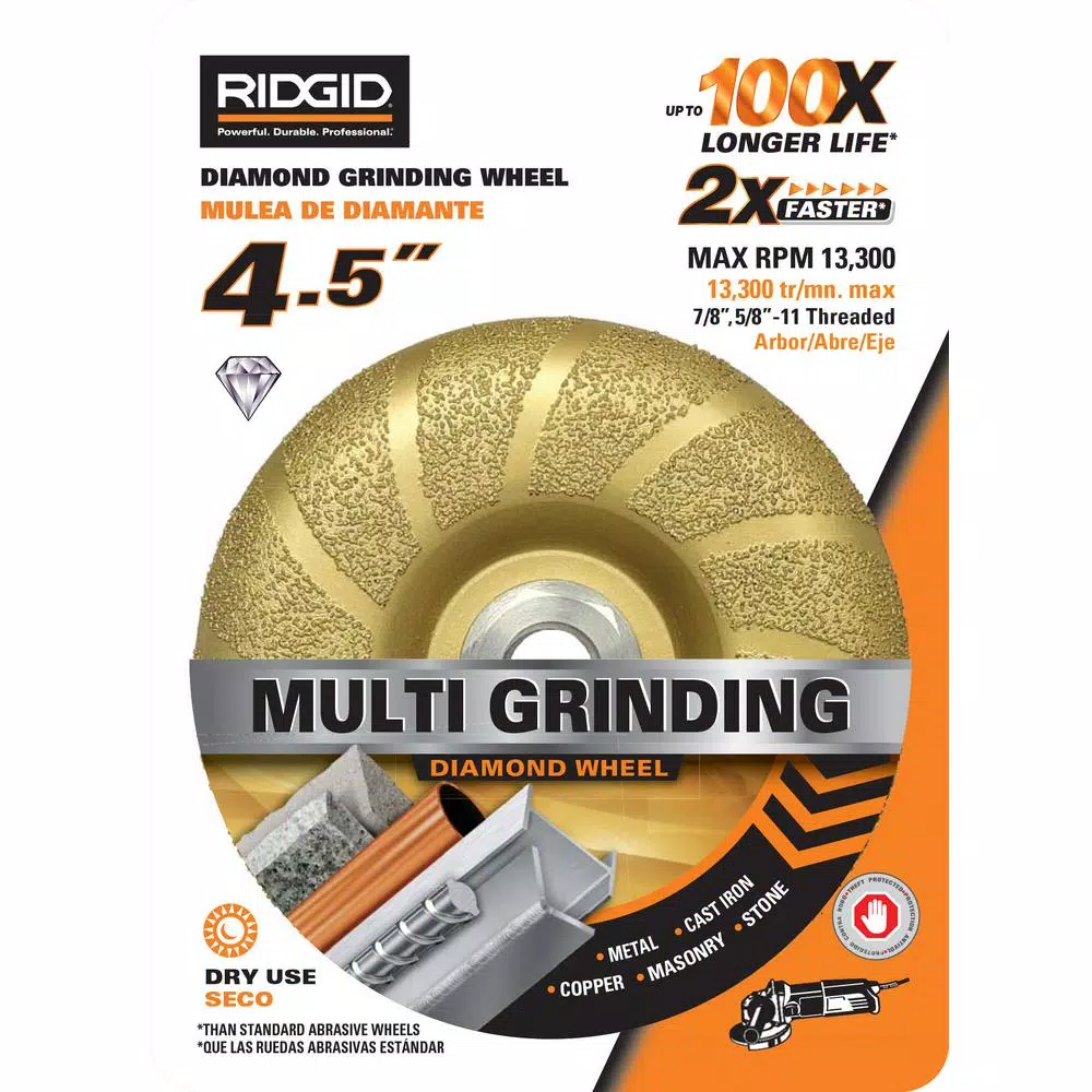 RIDGID V-Tech Multipurpose Grinding Wheels are engineered with top-grade industrial diamond for maximum grinding performance and superior grinding life. Vacuum Brazing technology provides 100X more life than standard abrasives. Unlike traditional abrasive grinding wheels the RIDGID Multi Purpose Wheels have a solid steel core which makes it safer to use and reduces sparks, dust and debris. These grinding wheels can be used for a wide range of materials such as Metal, Cast Iron, Copper, Masonry and Stone. 4.5 in. grinding wheel will fit a variety of small angle grinders with a 7/8 in. or 5/8 in.-11 threaded arbor. Dry use only.
