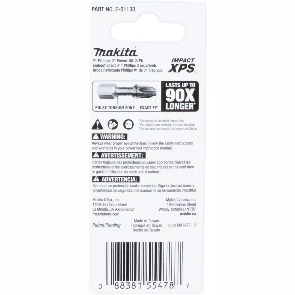 Makita ImpactXPS is new innovation in fastening with insert bits and fastening accessories built for the demands of the professional contractor. The ImpactXPS #1 Phillips 3 in. Power Bits are designed exclusively for use with high-torque impact drivers and are engineered to last up to 90-times longer than standard insert bits. High-strength steel delivers longer bit life and the precision-fit tip is engineered to prevent cam-out and stripping. The torsion section of the bit flexes under load to take pressure off of the bit tip for increased durability. The high quality steel construction is engineered for increased durability and features a matte nickel surface for best in class corrosion resistance. ImpactXPS #1 Phillips 3 in. Power Bits are ideal for the most demanding jobs including deck building, framing, installing plywood subfloor and more.