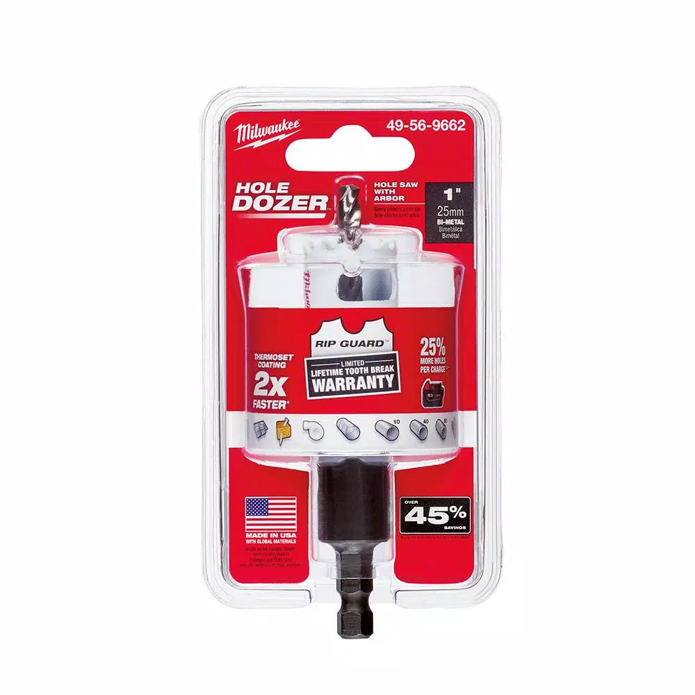 The Milwaukee Hole Dozer Hole Saw features Rip guard, the strongest tooth form in the industry, backed by the Rip guard limited lifetime tooth break warranty. Each tooth is built with more steel behind the cutting edge for added strength. The Rip Guard warranty on tooth breaks is a first for the hole saw industry. The added tooth strength along with 8% cobalt give added life to the teeth, allowing for increased productivity on the jobsite, as well as continued hole quality. The Hole Dozer includes Plug Jack, an all access slot design that allows for full access during plug removal. The Plug Jack gives access lower into the cup for thick material and higher towards the teeth for thin material. With multiple positions to apply leverage and better plug access, Plug Jack increases productivity and eliminates wasted downtime between holes. For fast, tool-free change-outs, use Milwaukee’s universal Quick-Change Arbors. 49-56-7210, 49-56-7240, 49-56-7250 and 49-56-9100.