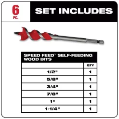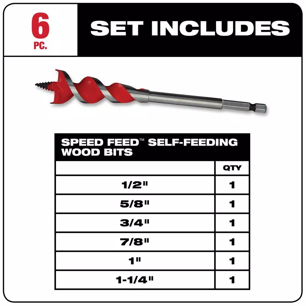 - Includes: one 7/8 in. x 6 in. speed feed wood bit (48-13-0078) one 5/8 in. x 6 in. speed feed wood bit (48-13-0058) one 3/4 in. x 6 in. speed feed wood bit (48-13-0068) one 1-1/4 in. x 6 in. speed feed wood bit (48-13-0108) one 1/2 in. x 6 in. speed feed wood bit (48-13-0048) one 1 in. x 6 in. speed feed wood bit  (48-13-0088)