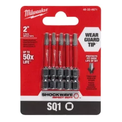 The MILWAUKEE SHOCKWAVE 2″ Impact Duty Square #1 Steel Power Bits are engineered to be the Most Durable, Best Fitting driver bits on the market. The Wear Guard Tip delivers increased wear resistance which protects the fit over the life of the bit. The Shockzone is optimized for for each tip type and length of driver bit to absorb peak torque and prevent breaking. The Custom Alloy76 has a customized steel and heat treatment per tip type to extend the life of the driver bits, providing up to 50X life vs. competitive impact driver bits. SHOCKWAVE driver bits are built to deliver extreme durability for the most demanding applications.