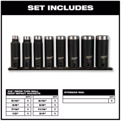 - 3/8 in. Deep Well Impact Socket Set (8-Piece) Includes: 5/16 in., 3/8 in., 7/16 in., 1/2 in., 9/16 in., 5/8 in., 11/16 in., 3/4 in.
