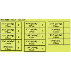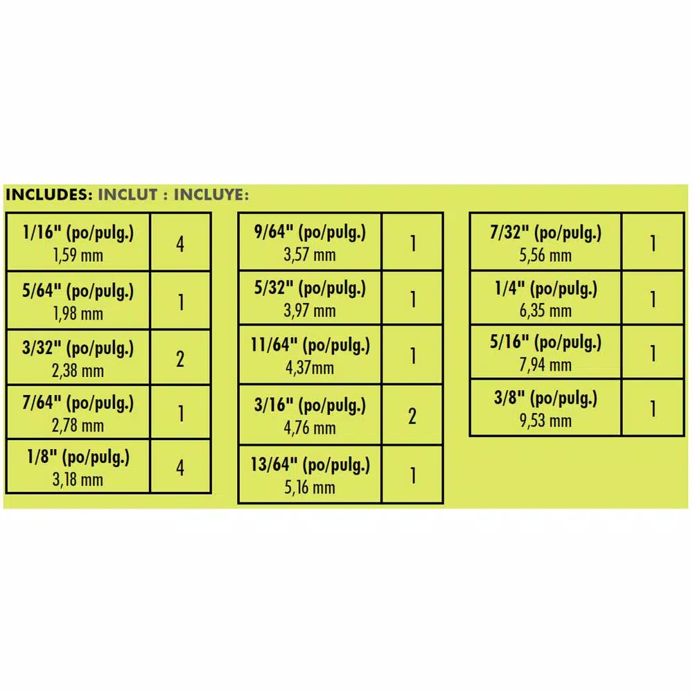 - Titanium Bits: Includes: (22) Titanium Coated Bits, sizes 1/16 in. to 3/8 in.