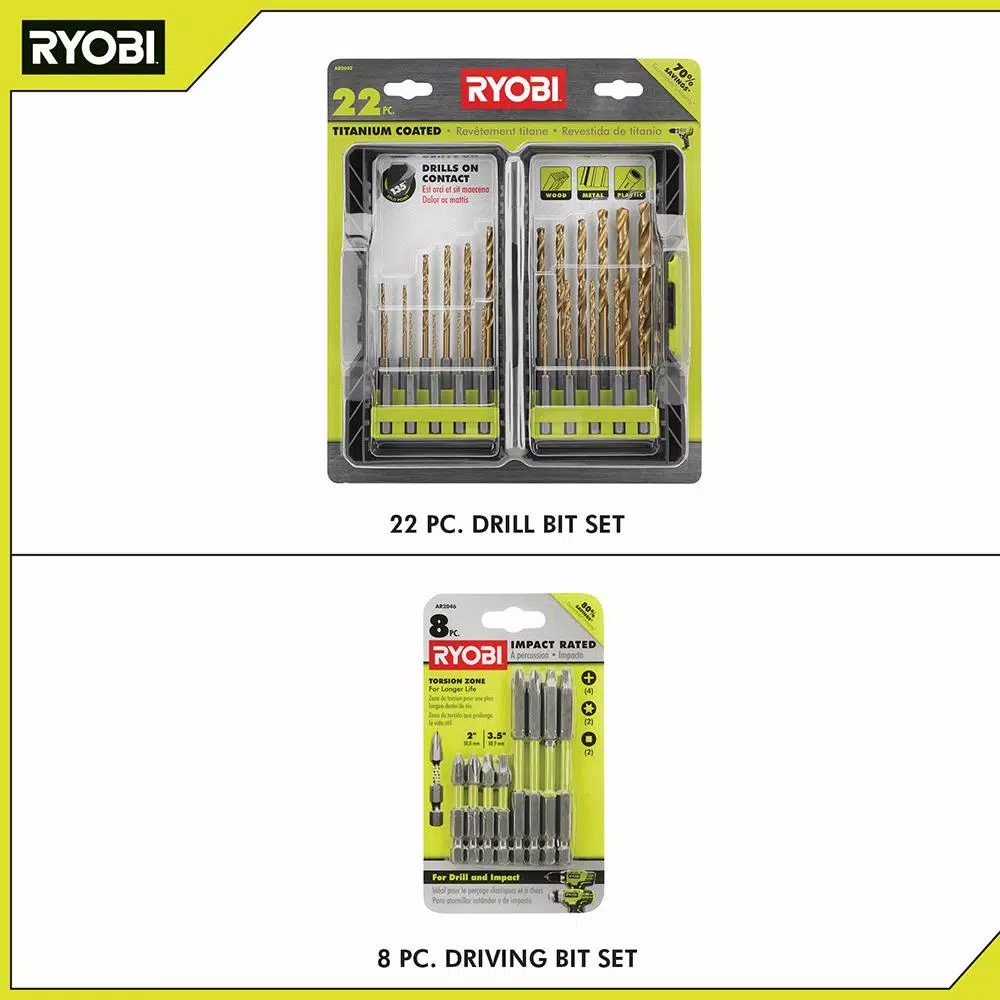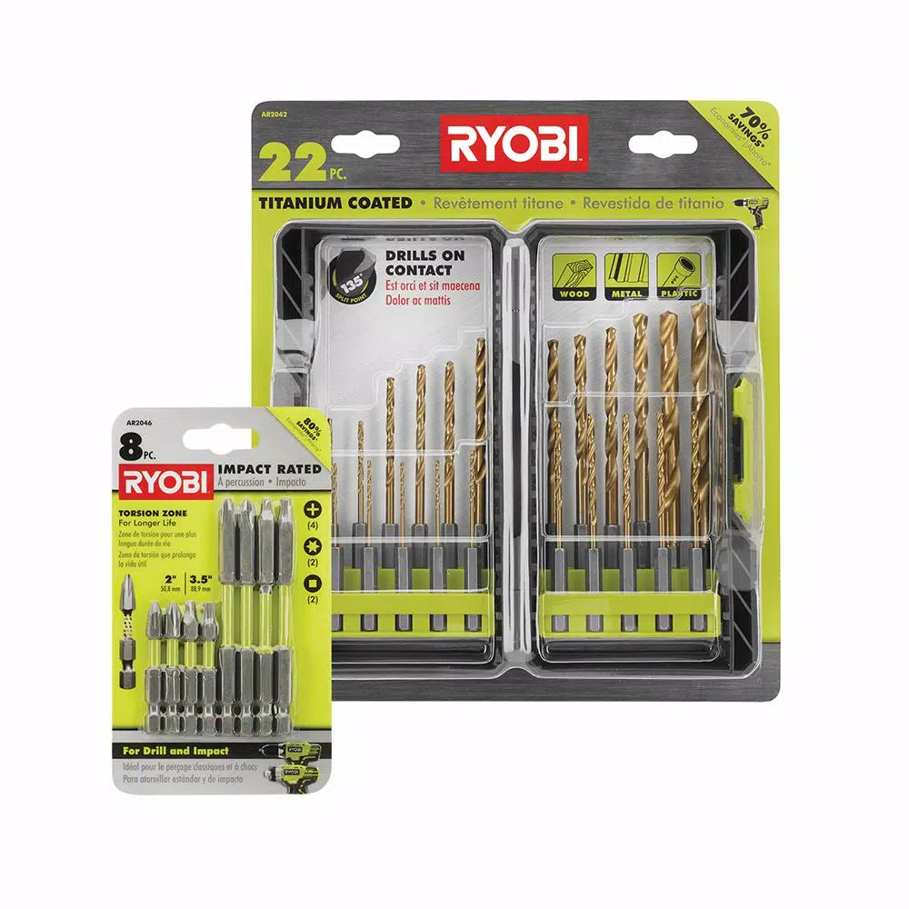 RYOBI introduces the Titanium Drill Bit Kit (22-Piece). The RYOBI 22-piece Titanium Coated Drill Bit Set makes a great addition to any tool set. Its bits range in size from 1/16 in. to 3/8 in. and all feature a 135° split point tip that prevents walking. All of the bits feature a 1/4 in. hex shank for easy bit changes and can be used for drilling wood, metal, and plastic material. The kit includes 22 titanium coated bits from 1/16 in. to 3/8 in. The Bonus Impact Rated Driving Kit (8-Piece) is built to withstand the high torque and demand that comes with the use of an impact driver. Easily interchange these bits in an impact driver or drill with the 1/4 in. hex shank. These 2 in. and 3.5 in. bits feature a TORSION ZONE that is engineered to absorb the high torque and demand that comes with the use of an impact driver. This 8-piece kit offers a variety of the most commonly used driving bits, such as Phillips, star and square bits.