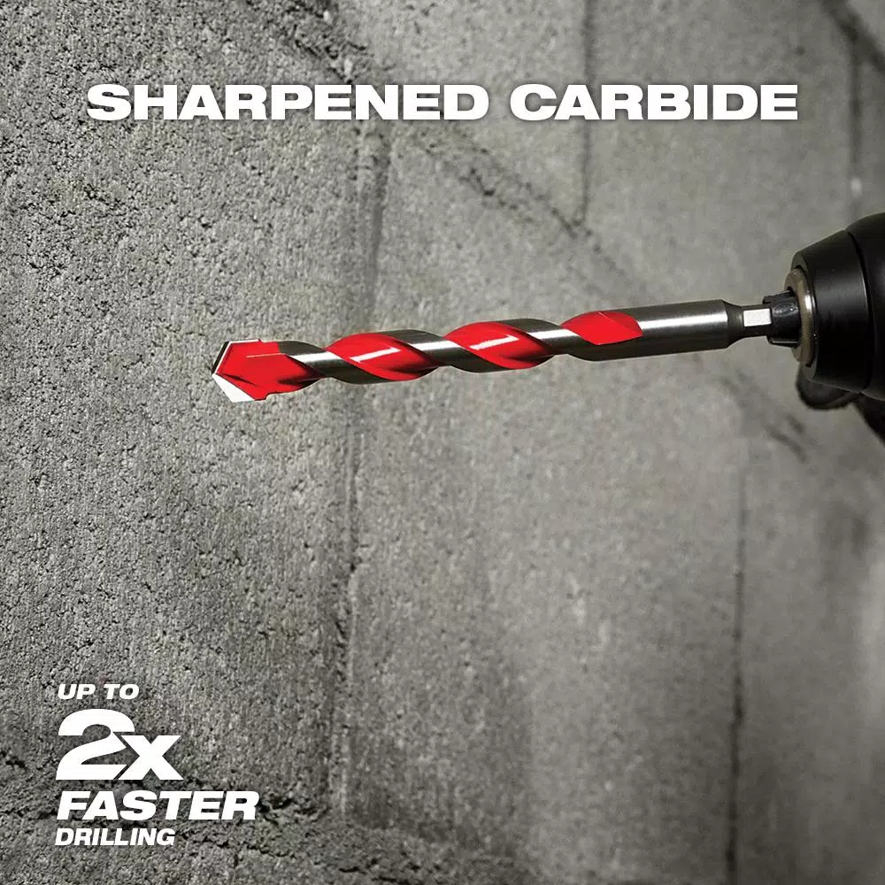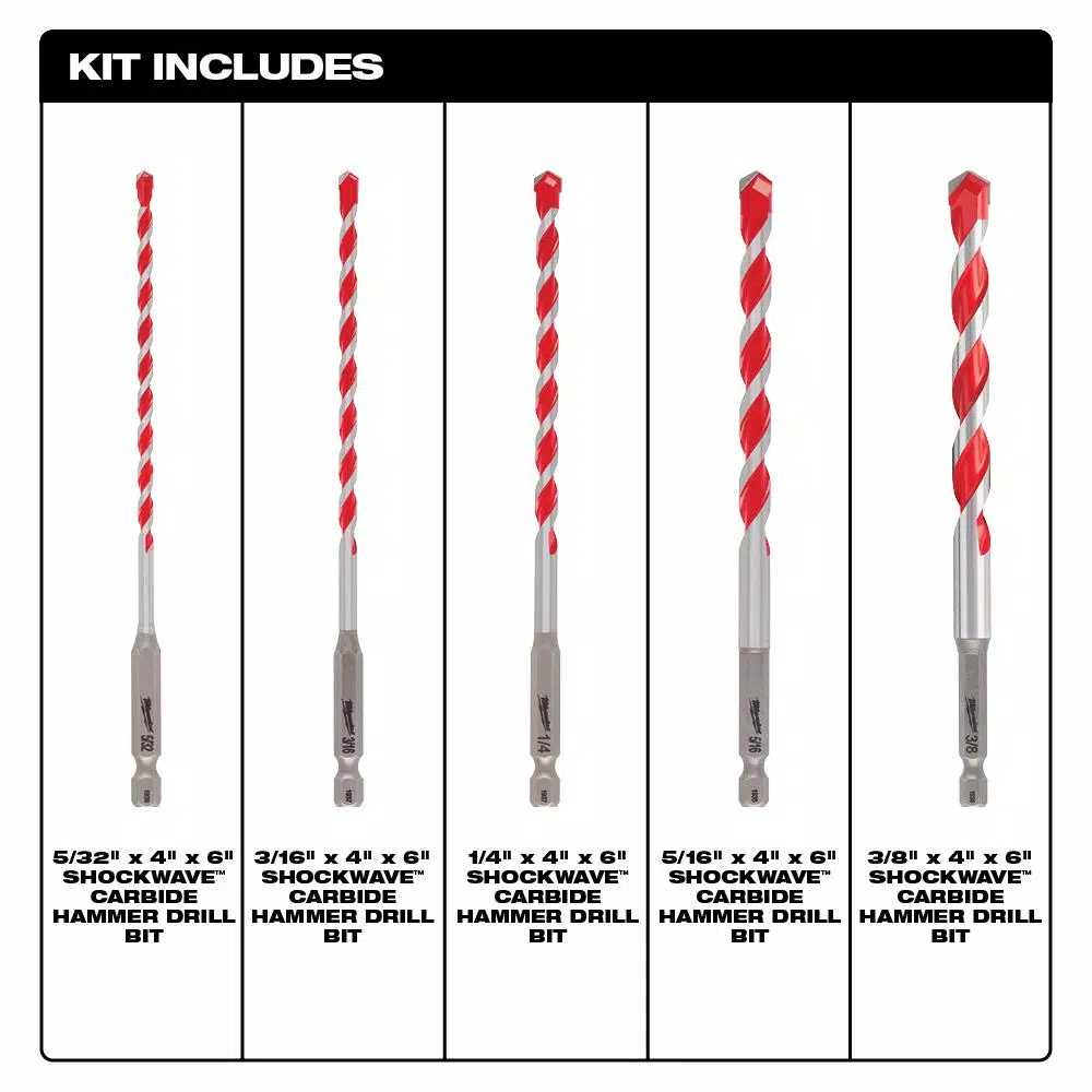 The Milwaukee 5-Piece SHOCKWAVE Carbide Hammer Drill Bit Kit uses sharpened carbide to deliver up to 5x longer life in concrete and up to 2x faster drilling into masonry materials. Engineered with a precision ground tip, these bits deliver faster starts and less walking in concrete, brick and block. The carbide-tipped masonry drill bits’ wide flute design removes dust faster, reducing heat and delivering more holes per charge. Equipped with a 1/4 in. Hex Shank, Milwaukee SHOCKWAVE Carbide Hammer Drill Bits are the ideal solution for drilling in masonry materials with both impacts and hammer drills/drivers. This drill bit kit includes one 5/32 in., one 3/16 in., one 1/4 in., one 5/16 in. and one 3/8 in. hammer drill bits.