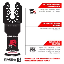 DIABLO’s universal fit bi-metal oscillating blades feature application specific designs that deliver maximum durability and longer life in clean wood applications. These high-performance blades feature an ultra-hardened cutting edge to deliver up to 5X longer life than standard blades. Curve contact edge creates a pilot for precise, clean plunge cuts with less vibration. An optimized Japanese tooth design and Black I.C.E. (Industrial Cooling Element) keeps the teeth cool and build up free for fast, clean cuts. The blade’s universal fit, adapter-free design easily attaches most tools, with the exception of Starlock tools.