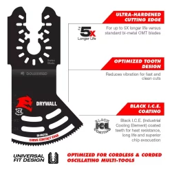 DIABLO’s universal fit bi-metal oscillating blades feature application specific designs that deliver maximum durability and longer life in drywall. These high-performance blades feature an ultra-hardened cutting edge to deliver up to 5X longer life than standard blades. Curve contact edge creates a pilot for precise, clean plunge cuts with less vibration. Black I.C.E. (Industrial Cooling Element) keeps the teeth cool and build up free for fast, clean cuts. The blade’s universal fit, adapter-free design easily attaches most tools, with the exception of Starlock tools.