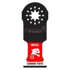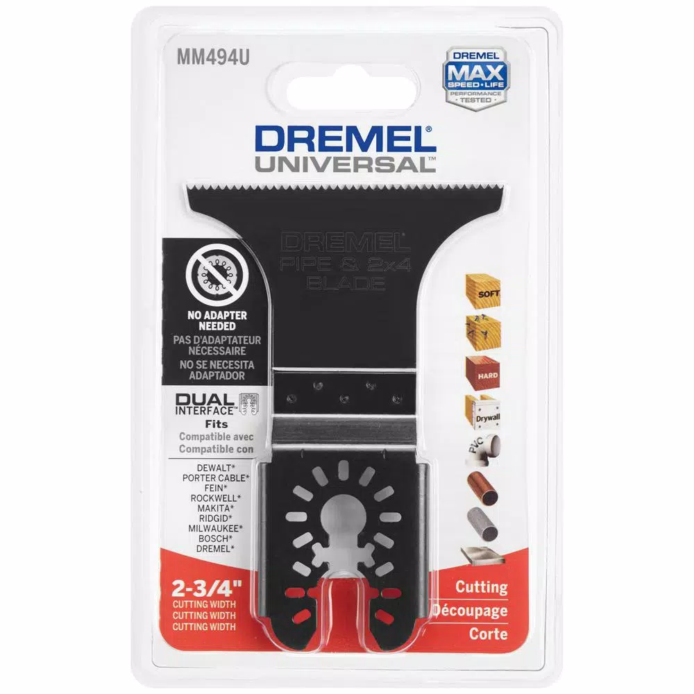 The Dremel MM494U pipe and 2X4 blade is made for cutting pipe and thick materials such as 2X4 studs. With an extra wide cutting edge, the MM494U adds control and convenience because users can now easily cut PVC, conduit and copper pipe without the blade slipping off of the work-piece. Cuts through a 2X4 can now be done in 1 pass as well. The blade’s Bi-Metal construction optimizes the MM494U for metal cutting, so you’ll experience no more destroyed teeth if you hit a nail while cutting. The Dual Interface allows its use with the most common oscillating tools in the market without the need of an adapter.