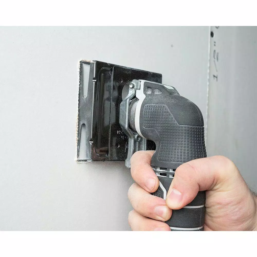 Multi-tool attachment head for cutting double gang boxes in drywall for existing construction (old work) boxes. This electrical wall box cutter features the following. Easily cuts drywall in just seconds to make installation of electrical boxes quick and easy. Must be used with an oscillating multi-tool and is compatible with most industry-standard multi-tool power tools. Used for installing plastic existing construction (old work) boxes and low voltage plates. Made of stainless steel for high durability and long life. Cuts a rectangular hole with dimensions: 4 in. W x 3 3/4 in. H.