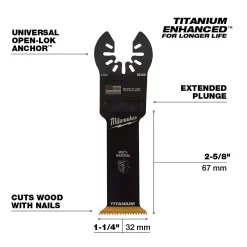The MILWAUKEE Universal Fit OPEN-LOK 1-1/4 in. Titanium Enhanced Bi-Metal Multi-Material Oscillating Multi-Tool Blade 1 Pack is made from premium high-speed steel. This 1-1/4 in. bi-metal blade is ideal for cuts in wood, nails, PVC, and drywall. The titanium enhanced bi-metal multi-tool blades deliver faster cuts vs the previous generation, featuring more teeth with an increased cutting width and a deeper plunge cut. These oscillating multi-tool blades are designed with global materials.