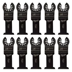 The MILWAUKEE Universal Fit OPEN-LOK Oscillating Multi-Tool 1-3/8 in. HCS Wood Blade 10 Pack is made from premium high carbon steel with edge ground teeth, providing users with optimal cutting performance in wood, PVC, drywall, and other soft materials. This Milwaukee blade delivers faster cuts than the previous generation of high carbon steel blades with more teeth and an increased 1-3/8 in. cutting width with a deeper plunge cut. This wood cutting blade for multi-tools is designed with global materials.