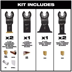 The MILWAUKEE Universal Fit OPEN-LOK 6-Piece Oscillating Multi-Tool General Purpose Blade Kit offers users an assortment of blades for the most common applications. The included Titanium Enhanced Bi-Metal blade uses premium high-speed steel and lasts up to 15X longer than standard high carbon steel blades. The bi-metal blade is ideal for smooth cuts in wood & nails, PVC, and drywall. The Triple Ground Japanese Tooth Blade delivers up to 2X faster cuts than the previous Milwaukee High Carbon Steel (HCS) blade and features a PRO-CURVE cutting edge for greater control. These multi-tool blades are ideal for fast, clean cuts in hardwood and can also be used in other woods, PVC, and drywall. The oscillating wood blades have been designed with aggressive, precision ground teeth for fast cuts in wood, drywall, and PVC. This oscillating tool blade variety pack is designed with global materials and includes a storage case.