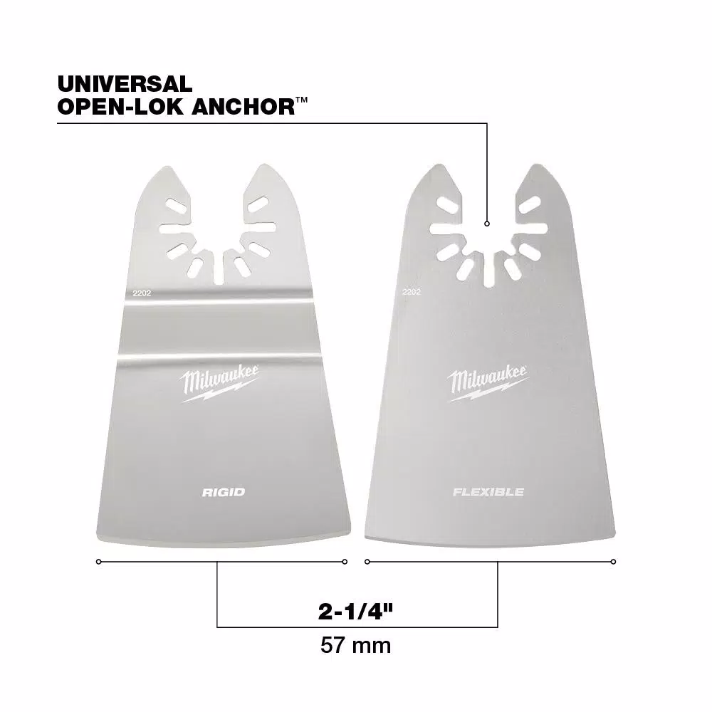 The Milwaukee Universal Fit OPEN-LOK 6-Piece Oscillating Multi-Tool General Purpose Blade Kit provides users with an assortment of blades for cutting hardwood, wood and nails, wood, PVC, and drywall. The included Titanium Enhanced Bi-Metal Blades use premium high-speed steel and last up to 15X longer than standard high carbon steel (HCS) blades. The bi-metal blade is ideal for smooth cuts in wood and nails, PVC, and drywall. The Triple Ground Japanese Tooth Blades deliver up to 2X faster cuts than the previous Milwaukee HCS blade and features a PRO-CURVE cutting edge for greater control. Ideal for fast, clean cuts in hardwood and can also be used in other woods, PVC, and drywall. The oscillating wood blade has been designed with precision ground aggressive teeth for fast cuts in wood, drywall, and PVC. This oscillating tool blade variety pack is designed with global materials and includes a storage case. The Milwaukee Universal Fit OPEN-LOK Tapered Sealant Cutting Blade 5-Pack is designed for Oscillating Multi-Tools. This multi-tool sealant cutting blade is made from solid stainless steel with a tapered triple ground cutting edge. The Milwaukee Universal Fit OPEN-LOK 2 in. Rigid and 2 in. Flexible Scraper 2-Piece Combo Pack is for Oscillating Multi-Tools. These multi-tool scrapers have a solid stainless steel construction with a sharp ground edge, ideal for quick removal of paints, adhesives, and sealants.