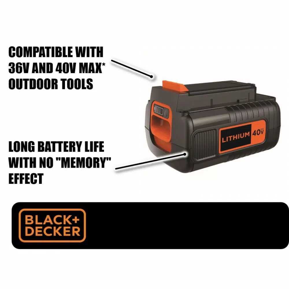This versatile battery powers all your 36-Volt Max and 40-Volt max outdoor tools, simplifying charging and reducing clutter in your garage or toolshed. Lithium-Ion technology delivers long battery life without a lot of weight. And with no memory’ effect, performance stays consistent over time. This battery features an onboard LED power meter that allows the user to easily check state of charge.