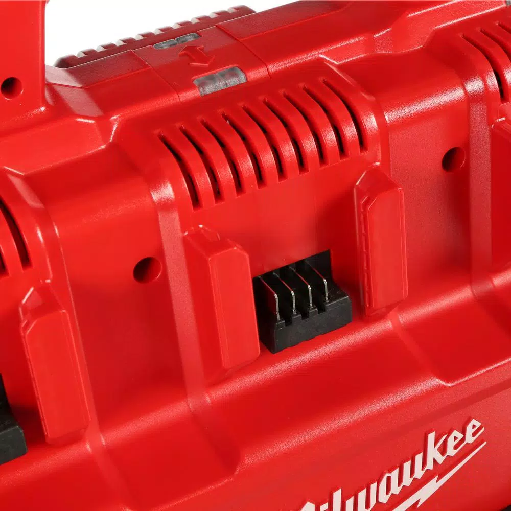 The M18 and M12 Rapid Charge Station is the fastest charging solution in the industry. With the ability to Charge 6 Pack 4X Faster, the station charges three batteries simultaneously while charging each pack up to 40% faster. The charger accepts up to (3) M18 and (3) M12 battery packs, reducing the amount of time spent changing out batteries and increasing productivity on the jobsite. Featuring REDLINK Intelligence, it communicates directly with the battery to monitor cell voltage, temperature and charge status to optimize the performance and extend the life of the pack. The station has integrated hang holes for vertical mounting, a pass through plug to conserve outlet space and a convenient carry handle to transport packs on and off the jobsite.
