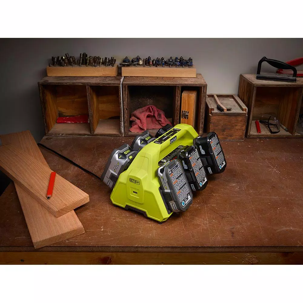 RYOBI introduces the 18-Volt ONE+ 6-Port Dual Chemistry IntelliPort SUPERCHARGER with USB Port. IntelliPort Technology allows users to maximize battery life while requiring less charging time than standard chargers. Featuring a 2 Amp USB Port allows users to charge smart devices while charging ONE+ batteries. The indicator lights show the battery and port status as batteries are charged and maintained. The charger includes sensors to determine whether your batteries are either too hot or too cold to charge and alert you with temperature indicator lights. This unit can charge both lithium-ion and Ni-Cd batteries in the RYOBI ONE+ series. Best of all, it is part of the RYOBI ONE+ System of over 175 Cordless Tools that all work on the same battery platform. Backed by the RYOBI 3-Year Manufacturer’s Warranty, this 18-Volt ONE+ 6-Port Dual Chemistry IntelliPort SUPERCHARGER with USB Port includes an operator’s manual. Batteries sold separately.