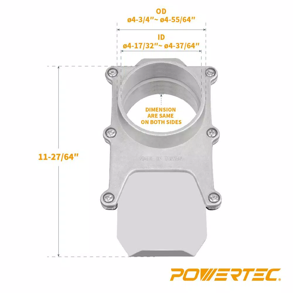Introducing the 5-Inch Aluminum Blast Gate by POWERTEC. This must-have dust collector attachment helps maximize your dust collector system by regulating proper air flow to your designated machine of choice. Open and closed, it acts as an in-line gate to control the vacuum flow to specified areas of your work shop. Additionally, this aluminum blast gate works seamlessly with properly sized plastic and metal ducts, flexible hoses and 5-inch ports for an assortment of popular brands. Self-Cleaning: Unlike other models that require constant attention, this unit possesses a self-cleaning gate (open slot) at the back that allows for clog-free operation. It also possesses a built-in stop that keeps the gate exactly where you need it during operation. When properly used, this self cleaning blast gate not only helps eliminate constant maintenance from jamming, but prevents air leakage that would otherwise disrupt your workflow. Premium Construction: Our Blast Gate features a solid aluminum body with a highly durable stainless steel gate providing a more long term and durable solution to plastic versions. Universal Fit: Featuring a nominal 5 inch OD diameter, this unit will provide a perfect fit for most professional and at-home workshop dust collection systems. Whether you re a beginner or seasoned woodworker, it s extremely easy to use and install.