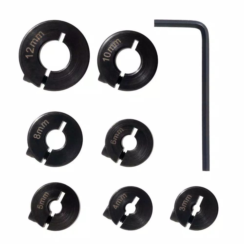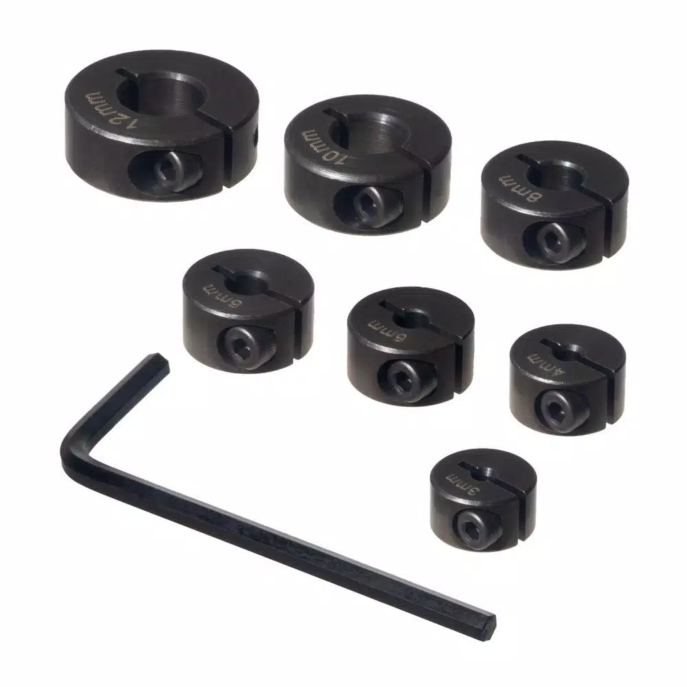 Introducing the 7-Piece Drill Bit Stop Collar Set by POWERTEC. This impressive collection of bit stop collars create the perfect drill holes with high precision and uniform depth for your portable drilling and woodworking applications. They feature a split ring design used to control the depth of the hole you are drilling – eliminating over and under drilling. This also helps to provide a secure, dependable grip around the diameter of your drill bit – delivering quick and easy utility. PREMIUM DESIGN: Each collar is made with heavy-duty stainless steel for long-term durability. They will not mar your expensive drill bits as they never touch the bits. Unlike other brands, we have wisely marked each stop for easy bit identification and enhanced workflow. 7-pieces SET CONTAINS: 3 mm bit stop collar, 4 mm bit stop collar, 5 mm bit stop collar, 6 mm bit stop collar, 8 mm bit stop collar, 10 mm bit stop collar, 12 mm bit stop collar. INCLUDED BONUS: An Allen Wrench is supplied to help adjust and install/uninstall the stop bits and can also be used for other projects.