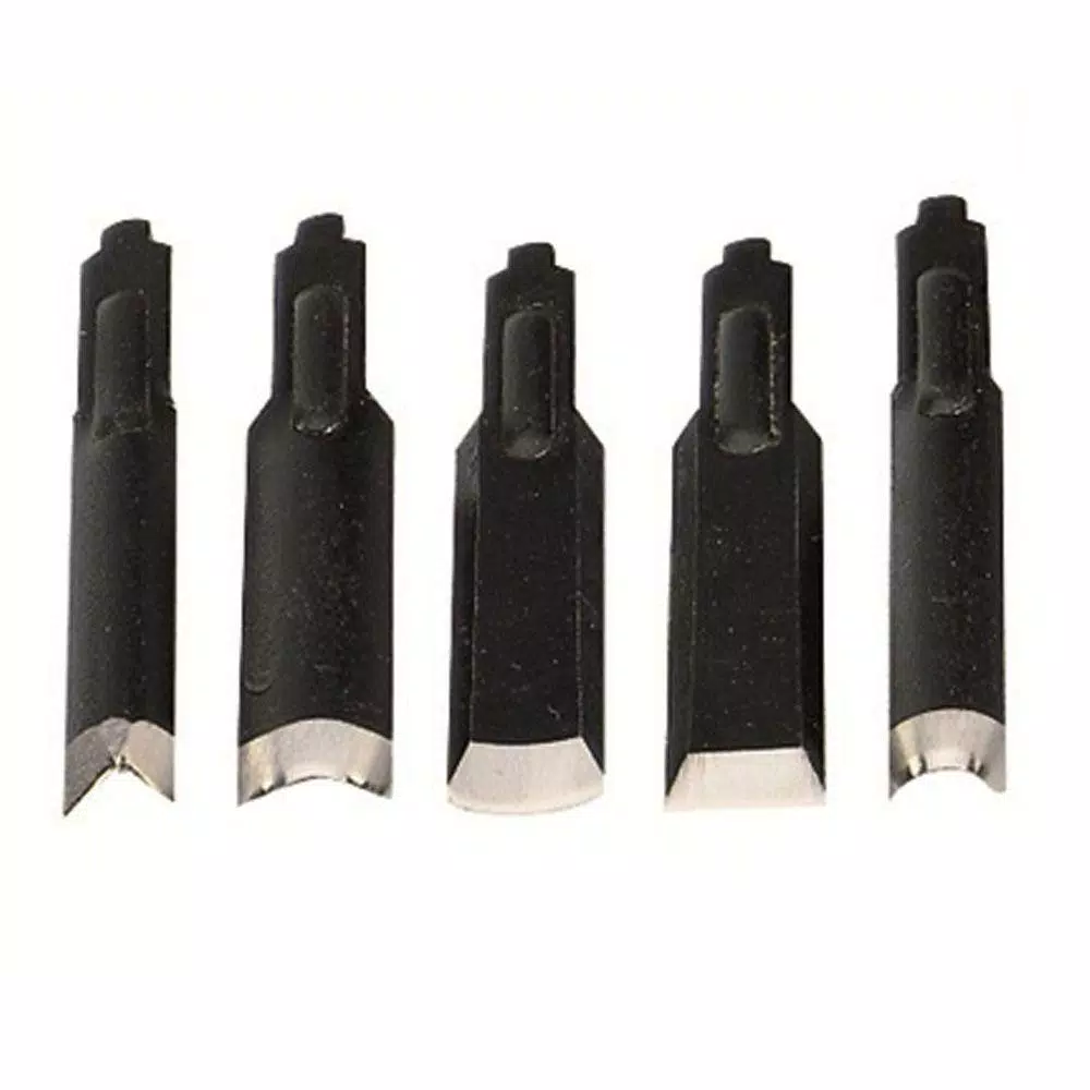 High quality laminated steel (bi-metal) blades in V shape, large and small gouge, flat with straight and rounded cutting edge. All 5 to a set. For carving and detailing wood (all types), plaster of Paris, gas concrete, linoleum. Also for removing fine layers of paint or finish.